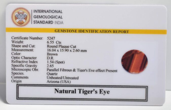 Beautiful 6.55 Cts Natural Tiger’s Eye (Good-Mines) sva 7+ Ratti TIGER’S EYE. Free Horoscope & Free Pundit Ji Astrological Advise / Consultation. Original Natural Lab certified gems by IGI GTL / Birth stones / Large Gem Selection of Shree Shubh Rashi Ratan Vedic Dhan at Gem Mines. May Bhagwan Brahma, Vishnu, Shiv & Universe bless you. This tiger eye stone is admired for its striking golden-brown brilliance and its ability to harmonize energies in daily life. The tiger eye stone benefit includes fostering clarity of thought, enhancing self-confidence, boosting focus, attracting prosperity, and offering a shield against negative influences. Wearing this authentic Tiger’s Eye gemstone adds elegance, spiritual fortitude, emotional balance, and a sense of protection, making it a cherished addition to any gemstone .