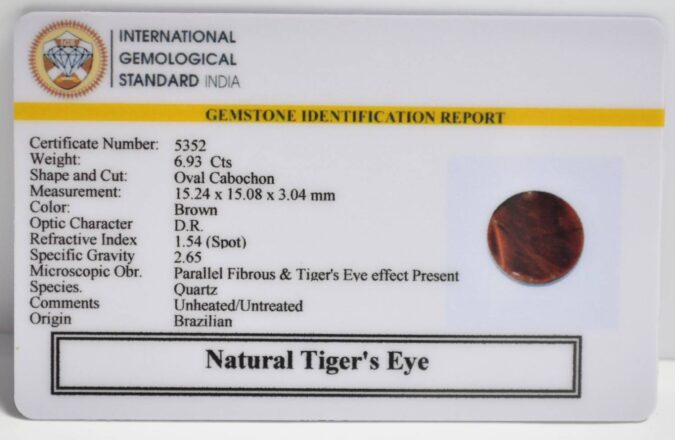 Beautiful 6.93 Cts Natural Tiger’s Eye (Very Good-Mines) sva 7+ Ratti TIGER’S EYE. Free Horoscope & Free Pundit Ji Astrological Advise / Consultation. Original Natural Lab certified gems by IGI GTL / Birth stones / Large Gem Selection of shree shubh Rashi Ratan Vedic dhan at Gem Mines. May Bhagwan Brahma, Vishnu, Shiv & Universe bless you.