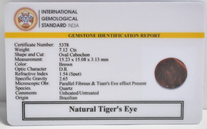 Beautiful 7.12 Cts Natural Tiger’s Eye (AAA-Mines) sva 7+ Ratti TIGER’S EYE. Free Horoscope & Free Pundit Ji Astrological Advise / Consultation. Original Natural Lab certified gems by IGI GTL / Birth stones / Large Gem Selection of shree shubh Rashi Ratan Vedic dhan at Gem Mines. May Bhagwan Brahma, Vishnu, Shiv & Universe bless you.
