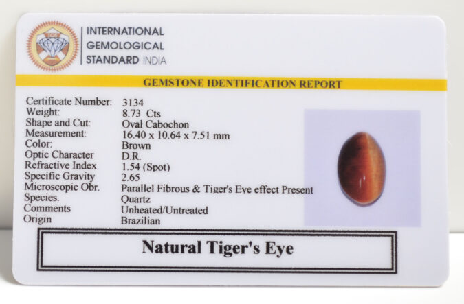 Beautiful 8.73 Cts Natural Tiger’s Eye (Good-Mines) sva 9+ Ratti TIGER’S EYE. Free Horoscope & Free Pundit Ji Astrological Advise / Consultation. Original Natural Lab certified gems by IGI GTL / Birth stones / Large Gem Selection of shree shubh Rashi Ratan Vedic dhan at Gem Mines. May Bhagwan Brahma, Vishnu, Shiv & Universe bless you.