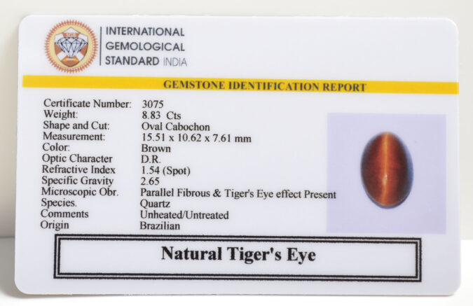 Beautiful 8.83 Cts Natural Tiger’s Eye (Top++-Mines) sva 9+ Ratti TIGER’S EYE. Free Horoscope & Free Pundit Ji Astrological Advise / Consultation. Original Natural Lab certified gems by IGI GTL / Birth stones / Large Gem Selection of shree shubh Rashi Ratan Vedic dhan at Gem Mines. May Bhagwan Brahma, Vishnu, Shiv & Universe bless you.