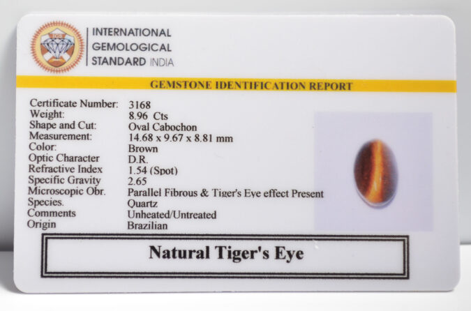 Beautiful 8.96 Cts Natural Tiger’s Eye (AAA+-Mines) sva 9+ Ratti TIGER’S EYE. Free Horoscope & Free Pundit Ji Astrological Advise / Consultation. Original Natural Lab certified gems by IGI GTL / Birth stones / Large Gem Selection of shree shubh Rashi Ratan Vedic dhan at Gem Mines. May Bhagwan Brahma, Vishnu, Shiv & Universe bless you.