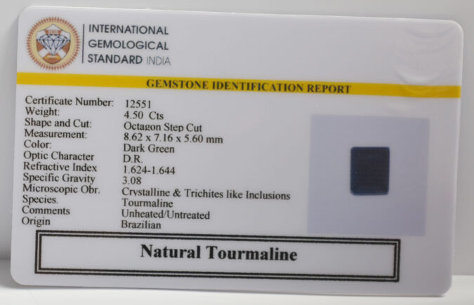Beautiful 4.5 Cts Natural Tourmaline (AAA+-Mines) sva 5+ Ratti TOURMALINE. Free Horoscope & Free Pundit Ji Astrological Advise / Consultation. Original Natural Lab certified gems by IGI GTL / Birth stones / Large Gem Selection of shree shubh Rashi Ratan Vedic dhan at Gem Mines. May Bhagwan Brahma, Vishnu, Shiv & Universe bless you.