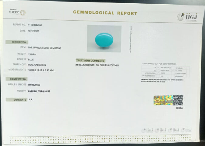 Beautiful 13.05 Cts Natural Turquoise (Firoza) (AAA+-Mines) sva 14+ Ratti TURQUOISE. Free Horoscope & Free Pundit Ji Astrological Advise / Consultation. Original Natural Lab certified gems by IGI GTL / Birth stones / Large Gem Selection of shree shubh Rashi Ratan Vedic dhan at Gem Mines. May Bhagwan Brahma, Vishnu, Shiv & Universe bless you.
