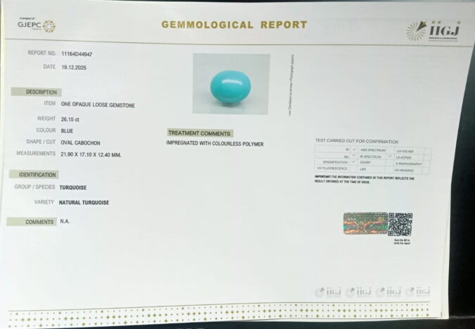 Beautiful 26.15 Cts Natural Turquoise (Firoza) (Top+-Mines) sva 29+ Ratti TURQUOISE. Free Horoscope & Free Pundit Ji Astrological Advise / Consultation. Original Natural Lab certified gems by IGI GTL / Birth stones / Large Gem Selection of shree shubh Rashi Ratan Vedic dhan at Gem Mines. May Bhagwan Brahma, Vishnu, Shiv & Universe bless you.