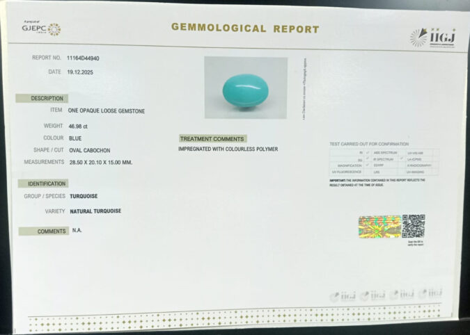 Beautiful 46.98 Cts Natural Turquoise (Firoza) (Top+-Mines) sva 52+ Ratti TURQUOISE. Free Horoscope & Free Pundit Ji Astrological Advise / Consultation. Original Natural Lab certified gems by IGI GTL / Birth stones / Large Gem Selection of shree shubh Rashi Ratan Vedic dhan at Gem Mines. May Bhagwan Brahma, Vishnu, Shiv & Universe bless you.