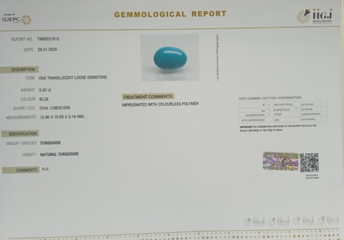 Beautiful 5.5 Ct. Natural Turquoise (Top++ Mines) sva 6+ Ratti Turquoise. Free Horoscope & Free Pundit Ji Astrological Advise / Consultation. Original Natural Lab certified gems by IGI GTL / Birth stones / Large Gem Selection of shree shubh Rashi Ratan Vedic dhan at Gem Mines. May Bhagwan Brahma, Vishnu, Shiv & Universe bless you.