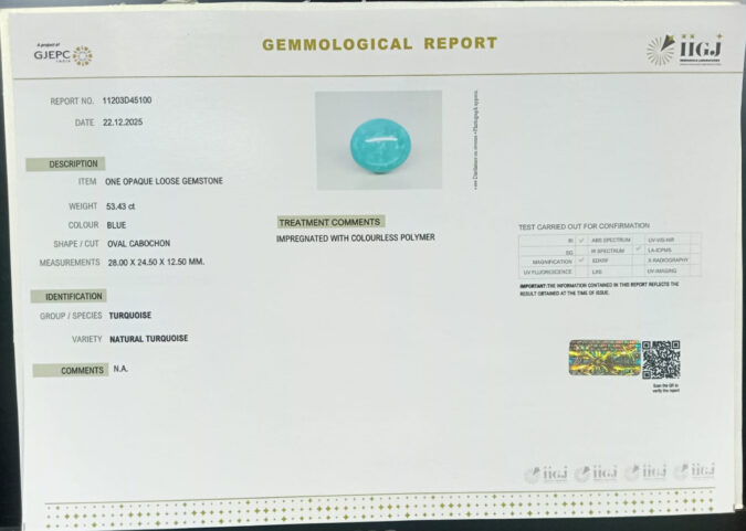 Beautiful 53.43 Cts Natural Turquoise (Firoza) (Top-Mines) sva 59+ Ratti TURQUOISE. Free Horoscope & Free Pundit Ji Astrological Advise / Consultation. Original Natural Lab certified gems by IGI GTL / Birth stones / Large Gem Selection of shree shubh Rashi Ratan Vedic dhan at Gem Mines. May Bhagwan Brahma, Vishnu, Shiv & Universe bless you.
