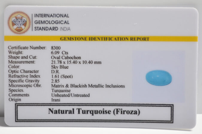Certified Natural Turquoise (Firoza) 6.09 Ct.(6+ Ratti) in Oval Cabochon shape