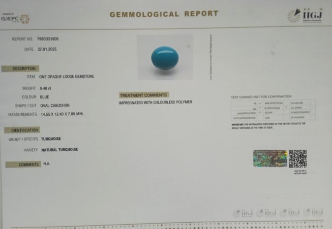 Beautiful 8.48 Ct. Natural Turquoise (Top++ Mines) sva 9+ Ratti Turquoise. Free Horoscope & Free Pundit Ji Astrological Advise / Consultation. Original Natural Lab certified gems by IGI GTL / Birth stones / Large Gem Selection of shree shubh Rashi Ratan Vedic dhan at Gem Mines. May Bhagwan Brahma, Vishnu, Shiv & Universe bless you.