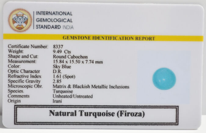 Beautiful 9.49 Cts Natural Turquoise (Firoza) (AAA+-Mines) sva 10+ Ratti TURQUOISE. Free Horoscope & Free Pundit Ji Astrological Advise / Consultation. Original Natural Lab certified gems by IGI GTL / Birth stones / Large Gem Selection of shree shubh Rashi Ratan Vedic dhan at Gem Mines. May Bhagwan Brahma, Vishnu, Shiv & Universe bless you.