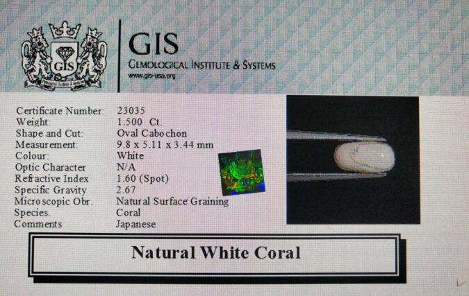 Beautiful 1.5 Ct. White Coral (Japanese Mines) Sava 1 Ratti Saphed Moonga. Free Horoscope & Free Pundit Ji Advise / Consultation. Original Natural Lab certified gems by IGI GTL / Birth stones / Large Gem Selection of shree shubh Rashi Ratan Vedic dhan at Gem Mines. May Bhagwan Brahma, Vishnu, Shiv & Universe bless you.