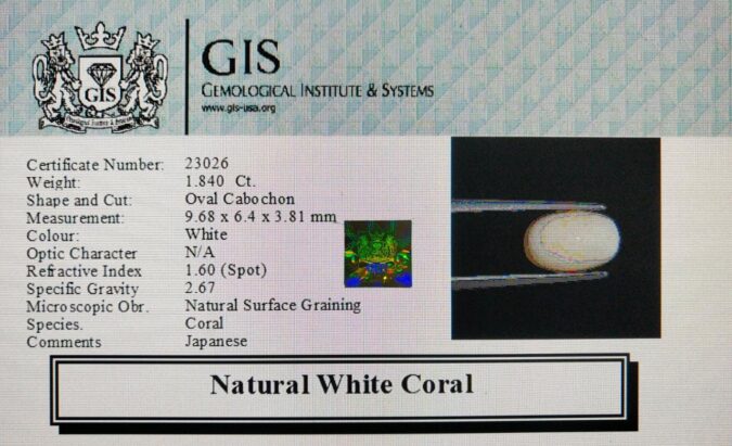 Beautiful 1.84 Ct. White Coral (Japanese Mines) Sava 2 Ratti Saphed Moonga. Free Horoscope & Free Pundit Ji Advise / Consultation. Original Natural Lab certified gems by IGI GTL / Birth stones / Large Gem Selection of shree shubh Rashi Ratan Vedic dhan at Gem Mines. May Bhagwan Brahma, Vishnu, Shiv & Universe bless you.