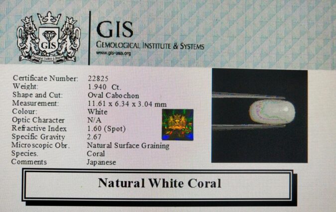 Beautiful 1.94 Ct. White Coral (Japanese Mines) Sava 2 Ratti Saphed Moonga. Free Horoscope & Free Pundit Ji Advise / Consultation. Original Natural Lab certified gems by IGI GTL / Birth stones / Large Gem Selection of shree shubh Rashi Ratan Vedic dhan at Gem Mines. May Bhagwan Brahma, Vishnu, Shiv & Universe bless you.
