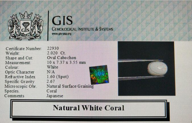 Beautiful 2.02 Ct. White Coral (Japanese Mines) Sava 2 Ratti Saphed Moonga. Free Horoscope & Free Pundit Ji Advise / Consultation. Original Natural Lab certified gems by IGI GTL / Birth stones / Large Gem Selection of shree shubh Rashi Ratan Vedic dhan at Gem Mines. May Bhagwan Brahma, Vishnu, Shiv & Universe bless you.