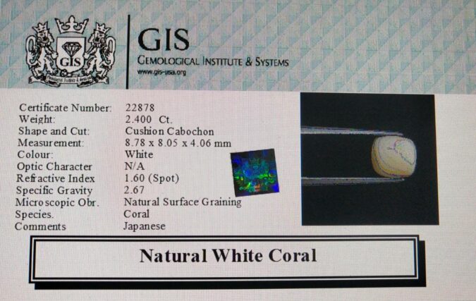 Beautiful 2.4 Ct. White Coral (Japanese Mines) Sava 2 Ratti Saphed Moonga. Free Horoscope & Free Pundit Ji Advise / Consultation. Original Natural Lab certified gems by IGI GTL / Birth stones / Large Gem Selection of shree shubh Rashi Ratan Vedic dhan at Gem Mines. May Bhagwan Brahma, Vishnu, Shiv & Universe bless you.