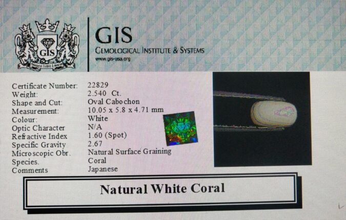 Beautiful 2.54 Ct. White Coral (Japanese Mines) Sava 2 Ratti Saphed Moonga. Free Horoscope & Free Pundit Ji Advise / Consultation. Original Natural Lab certified gems by IGI GTL / Birth stones / Large Gem Selection of shree shubh Rashi Ratan Vedic dhan at Gem Mines. May Bhagwan Brahma, Vishnu, Shiv & Universe bless you.