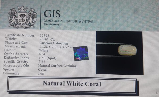 Beautiful 2.58 Ct. White Coral (Japanese Mines) Sava 2 Ratti Saphed Moonga. Free Horoscope & Free Pundit Ji Advise / Consultation. Original Natural Lab certified gems by IGI GTL / Birth stones / Large Gem Selection of shree shubh Rashi Ratan Vedic dhan at Gem Mines. May Bhagwan Brahma, Vishnu, Shiv & Universe bless you.