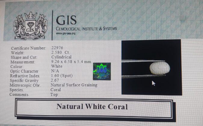 Beautiful 2.58 Ct. White Coral (Japanese Mines) Sava 2 Ratti Saphed Moonga. Free Horoscope & Free Pundit Ji Advise / Consultation. Original Natural Lab certified gems by IGI GTL / Birth stones / Large Gem Selection of shree shubh Rashi Ratan Vedic dhan at Gem Mines. May Bhagwan Brahma, Vishnu, Shiv & Universe bless you.