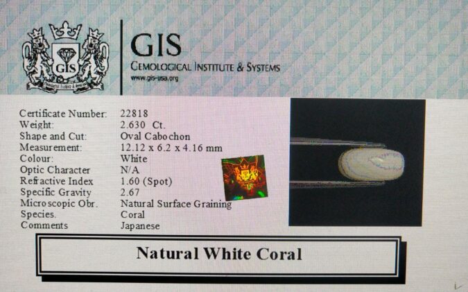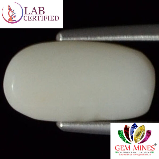 Beautiful 2.63 Ct. White Coral (Japanese Mines) Sava 2 Ratti Saphed Moonga. Free Horoscope & Free Pundit Ji Advise / Consultation. Original Natural Lab certified gems by IGI GTL / Birth stones / Large Gem Selection of shree shubh Rashi Ratan Vedic dhan at Gem Mines. May Bhagwan Brahma, Vishnu, Shiv & Universe bless you.