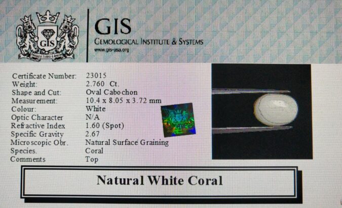 Beautiful 2.76 Ct. White Coral (Japanese Mines) Sava 3 Ratti Saphed Moonga. Free Horoscope & Free Pundit Ji Advise / Consultation. Original Natural Lab certified gems by IGI GTL / Birth stones / Large Gem Selection of shree shubh Rashi Ratan Vedic dhan at Gem Mines. May Bhagwan Brahma, Vishnu, Shiv & Universe bless you.