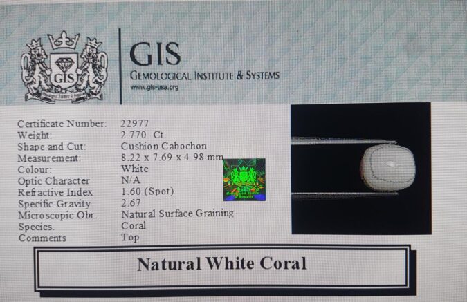 Beautiful 2.77 Ct. White Coral (Japanese Mines) Sava 3 Ratti Saphed Moonga. Free Horoscope & Free Pundit Ji Advise / Consultation. Original Natural Lab certified gems by IGI GTL / Birth stones / Large Gem Selection of shree shubh Rashi Ratan Vedic dhan at Gem Mines. May Bhagwan Brahma, Vishnu, Shiv & Universe bless you.