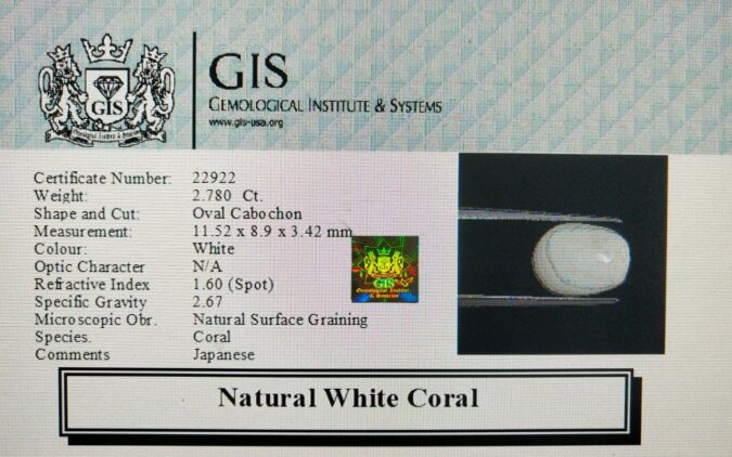 Beautiful 2.78 Ct. White Coral (Japanese Mines) Sava 3 Ratti Saphed Moonga. Free Horoscope & Free Pundit Ji Advise / Consultation. Original Natural Lab certified gems by IGI GTL / Birth stones / Large Gem Selection of shree shubh Rashi Ratan Vedic dhan at Gem Mines. May Bhagwan Brahma, Vishnu, Shiv & Universe bless you.