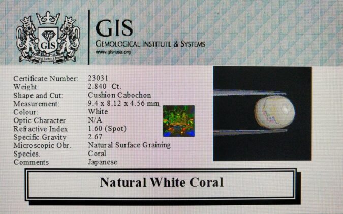 Beautiful 2.84 Ct. White Coral (Japanese Mines) Sava 3 Ratti Saphed Moonga. Free Horoscope & Free Pundit Ji Advise / Consultation. Original Natural Lab certified gems by IGI GTL / Birth stones / Large Gem Selection of shree shubh Rashi Ratan Vedic dhan at Gem Mines. May Bhagwan Brahma, Vishnu, Shiv & Universe bless you.