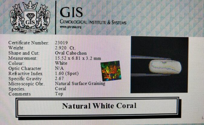Beautiful 2.92 Ct. White Coral (Japanese Mines) Sava 3 Ratti Saphed Moonga. Free Horoscope & Free Pundit Ji Advise / Consultation. Original Natural Lab certified gems by IGI GTL / Birth stones / Large Gem Selection of shree shubh Rashi Ratan Vedic dhan at Gem Mines. May Bhagwan Brahma, Vishnu, Shiv & Universe bless you.