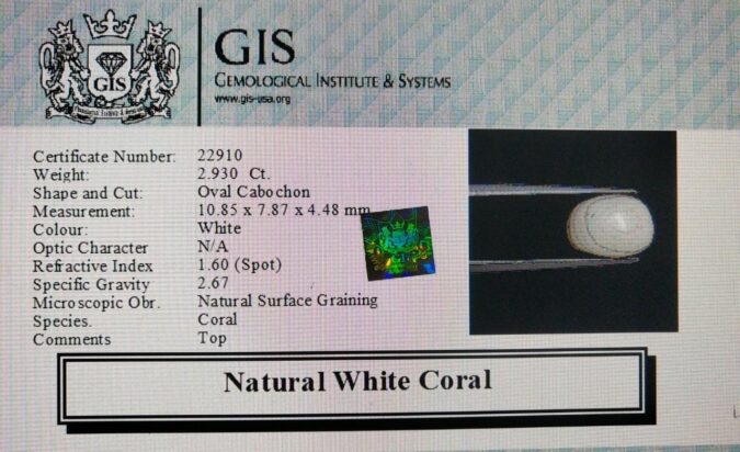 Beautiful 2.93 Ct. White Coral (Japanese Mines) Sava 3 Ratti Saphed Moonga. Free Horoscope & Free Pundit Ji Advise / Consultation. Original Natural Lab certified gems by IGI GTL / Birth stones / Large Gem Selection of shree shubh Rashi Ratan Vedic dhan at Gem Mines. May Bhagwan Brahma, Vishnu, Shiv & Universe bless you.
