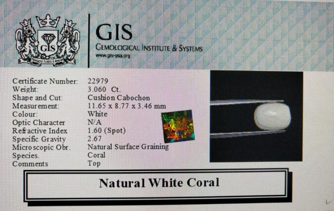Beautiful 3.06 Ct. White Coral (Japanese Mines) Sava 3 Ratti Saphed Moonga. Free Horoscope & Free Pundit Ji Advise / Consultation. Original Natural Lab certified gems by IGI GTL / Birth stones / Large Gem Selection of shree shubh Rashi Ratan Vedic dhan at Gem Mines. May Bhagwan Brahma, Vishnu, Shiv & Universe bless you.
