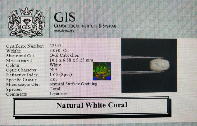 Beautiful 3.09 Ct. White Coral (Japanese Mines) Sava 3 Ratti Saphed Moonga. Free Horoscope & Free Pundit Ji Advise / Consultation. Original Natural Lab certified gems by IGI GTL / Birth stones / Large Gem Selection of shree shubh Rashi Ratan Vedic dhan at Gem Mines. May Bhagwan Brahma, Vishnu, Shiv & Universe bless you.