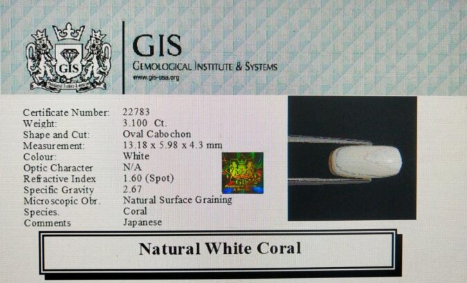 Beautiful 3.1 Ct. White Coral (Japanese Mines) Sava 3 Ratti Saphed Moonga. Free Horoscope & Free Pundit Ji Advise / Consultation. Original Natural Lab certified gems by IGI GTL / Birth stones / Large Gem Selection of shree shubh Rashi Ratan Vedic dhan at Gem Mines. May Bhagwan Brahma, Vishnu, Shiv & Universe bless you.