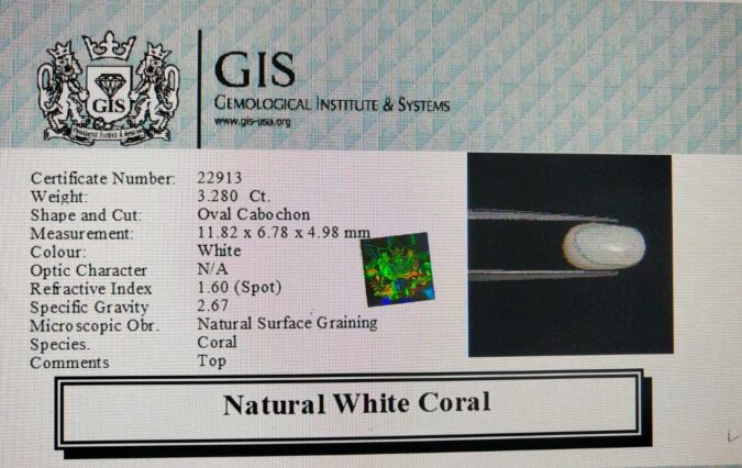 Beautiful 3.28 Ct. White Coral (Japanese Mines) Sava 3 Ratti Saphed Moonga. Free Horoscope & Free Pundit Ji Advise / Consultation. Original Natural Lab certified gems by IGI GTL / Birth stones / Large Gem Selection of shree shubh Rashi Ratan Vedic dhan at Gem Mines. May Bhagwan Brahma, Vishnu, Shiv & Universe bless you.