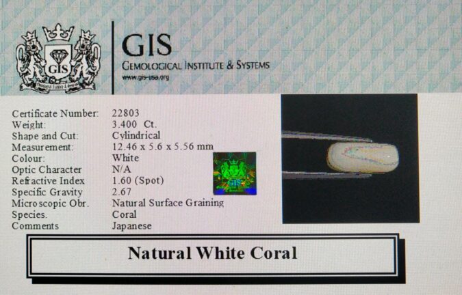 Beautiful 3.4 Ct. White Coral (Japanese Mines) Sava 3 Ratti Saphed Moonga. Free Horoscope & Free Pundit Ji Advise / Consultation. Original Natural Lab certified gems by IGI GTL / Birth stones / Large Gem Selection of shree shubh Rashi Ratan Vedic dhan at Gem Mines. May Bhagwan Brahma, Vishnu, Shiv & Universe bless you.