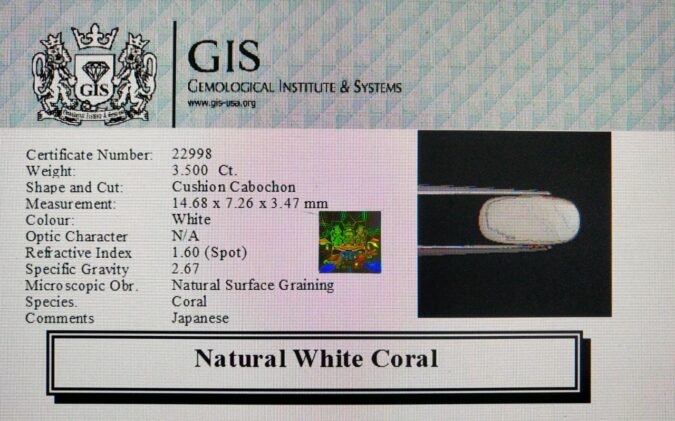 Beautiful 3.5 Ct. White Coral (Japanese Mines) Sava 3 Ratti Saphed Moonga. Free Horoscope & Free Pundit Ji Advise / Consultation. Original Natural Lab certified gems by IGI GTL / Birth stones / Large Gem Selection of shree shubh Rashi Ratan Vedic dhan at Gem Mines. May Bhagwan Brahma, Vishnu, Shiv & Universe bless you.
