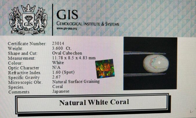 Beautiful 3.6 Ct. White Coral (Japanese Mines) Sava 4 Ratti Saphed Moonga. Free Horoscope & Free Pundit Ji Advise / Consultation. Original Natural Lab certified gems by IGI GTL / Birth stones / Large Gem Selection of shree shubh Rashi Ratan Vedic dhan at Gem Mines. May Bhagwan Brahma, Vishnu, Shiv & Universe bless you.