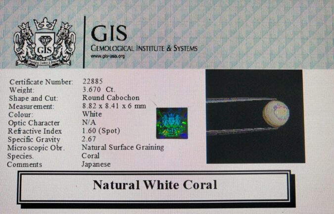 Beautiful 3.67 Ct. White Coral (Japanese Mines) Sava 4 Ratti Saphed Moonga. Free Horoscope & Free Pundit Ji Advise / Consultation. Original Natural Lab certified gems by IGI GTL / Birth stones / Large Gem Selection of shree shubh Rashi Ratan Vedic dhan at Gem Mines. May Bhagwan Brahma, Vishnu, Shiv & Universe bless you.