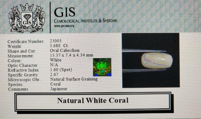 Beautiful 3.68 Ct. White Coral (Japanese Mines) Sava 4 Ratti Saphed Moonga. Free Horoscope & Free Pundit Ji Advise / Consultation. Original Natural Lab certified gems by IGI GTL / Birth stones / Large Gem Selection of shree shubh Rashi Ratan Vedic dhan at Gem Mines. May Bhagwan Brahma, Vishnu, Shiv & Universe bless you.
