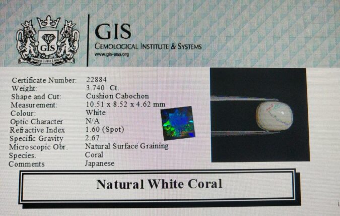 Beautiful 3.74 Ct. White Coral (Japanese Mines) Sava 4 Ratti Saphed Moonga. Free Horoscope & Free Pundit Ji Advise / Consultation. Original Natural Lab certified gems by IGI GTL / Birth stones / Large Gem Selection of shree shubh Rashi Ratan Vedic dhan at Gem Mines. May Bhagwan Brahma, Vishnu, Shiv & Universe bless you.