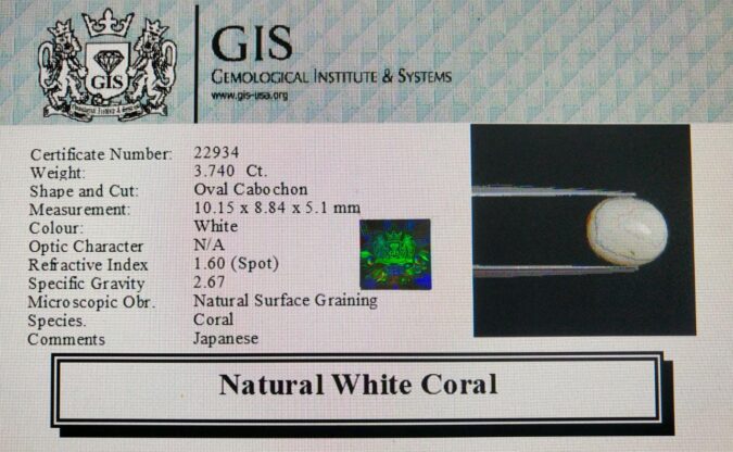 Beautiful 3.74 Ct. White Coral (Japanese Mines) Sava 4 Ratti Saphed Moonga. Free Horoscope & Free Pundit Ji Advise / Consultation. Original Natural Lab certified gems by IGI GTL / Birth stones / Large Gem Selection of shree shubh Rashi Ratan Vedic dhan at Gem Mines. May Bhagwan Brahma, Vishnu, Shiv & Universe bless you.
