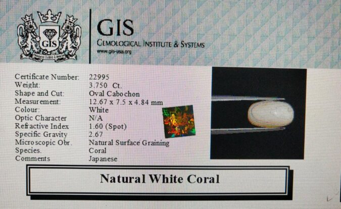 Beautiful 3.75 Ct. White Coral (Japanese Mines) Sava 4 Ratti Saphed Moonga. Free Horoscope & Free Pundit Ji Advise / Consultation. Original Natural Lab certified gems by IGI GTL / Birth stones / Large Gem Selection of shree shubh Rashi Ratan Vedic dhan at Gem Mines. May Bhagwan Brahma, Vishnu, Shiv & Universe bless you.