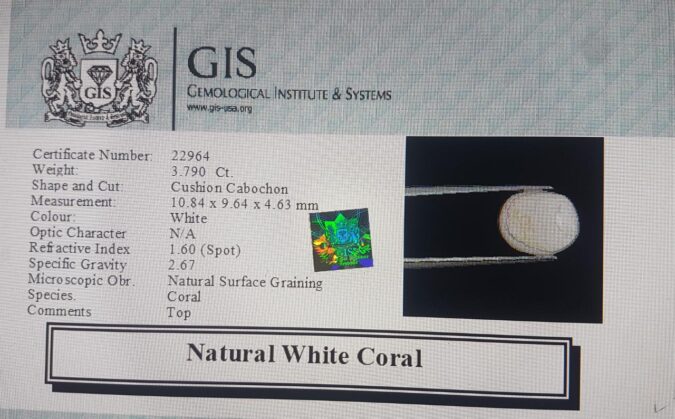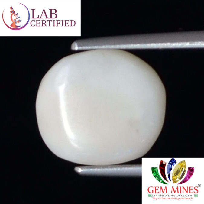 Beautiful 3.79 Ct. White Coral (Japanese Mines) Sava 4 Ratti Saphed Moonga. Free Horoscope & Free Pundit Ji Advise / Consultation. Original Natural Lab certified gems by IGI GTL / Birth stones / Large Gem Selection of shree shubh Rashi Ratan Vedic dhan at Gem Mines. May Bhagwan Brahma, Vishnu, Shiv & Universe bless you.