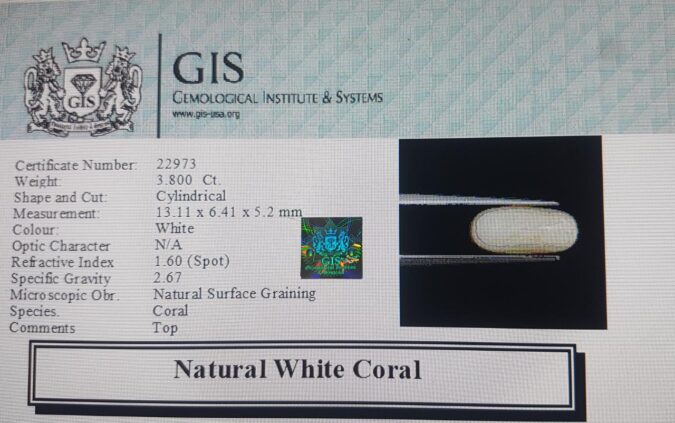 Beautiful 3.8 Ct. White Coral (Japanese Mines) Sava 4 Ratti Saphed Moonga. Free Horoscope & Free Pundit Ji Advise / Consultation. Original Natural Lab certified gems by IGI GTL / Birth stones / Large Gem Selection of shree shubh Rashi Ratan Vedic dhan at Gem Mines. May Bhagwan Brahma, Vishnu, Shiv & Universe bless you.