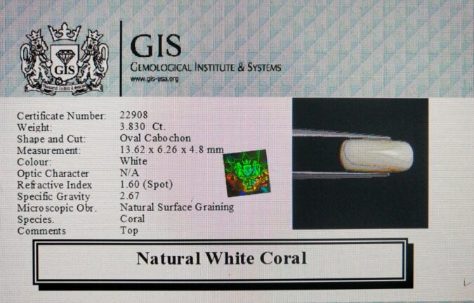 Beautiful 3.83 Ct. White Coral (Japanese Mines) Sava 4 Ratti Saphed Moonga. Free Horoscope & Free Pundit Ji Advise / Consultation. Original Natural Lab certified gems by IGI GTL / Birth stones / Large Gem Selection of shree shubh Rashi Ratan Vedic dhan at Gem Mines. May Bhagwan Brahma, Vishnu, Shiv & Universe bless you.