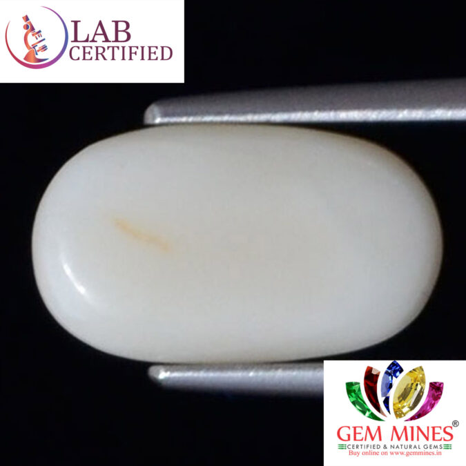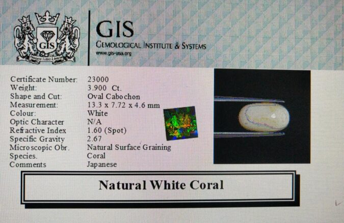 Beautiful 3.9 Ct. White Coral (Japanese Mines) Sava 4 Ratti Saphed Moonga. Free Horoscope & Free Pundit Ji Advise / Consultation. Original Natural Lab certified gems by IGI GTL / Birth stones / Large Gem Selection of shree shubh Rashi Ratan Vedic dhan at Gem Mines. May Bhagwan Brahma, Vishnu, Shiv & Universe bless you.
