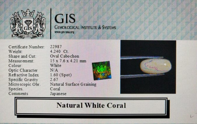 Beautiful 4.24 Ct. White Coral (Japanese Mines) Sava 4 Ratti Saphed Moonga. Free Horoscope & Free Pundit Ji Advise / Consultation. Original Natural Lab certified gems by IGI GTL / Birth stones / Large Gem Selection of shree shubh Rashi Ratan Vedic dhan at Gem Mines. May Bhagwan Brahma, Vishnu, Shiv & Universe bless you.