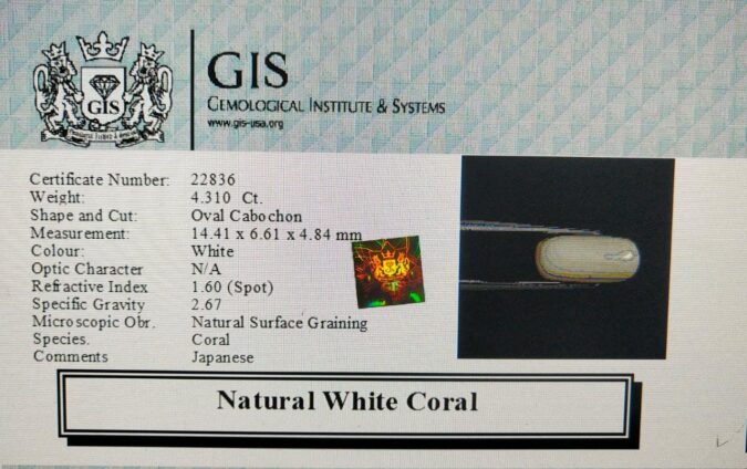 Beautiful 4.31 Ct. White Coral (Japanese Mines) Sava 4 Ratti Saphed Moonga. Free Horoscope & Free Pundit Ji Advise / Consultation. Original Natural Lab certified gems by IGI GTL / Birth stones / Large Gem Selection of shree shubh Rashi Ratan Vedic dhan at Gem Mines. May Bhagwan Brahma, Vishnu, Shiv & Universe bless you.