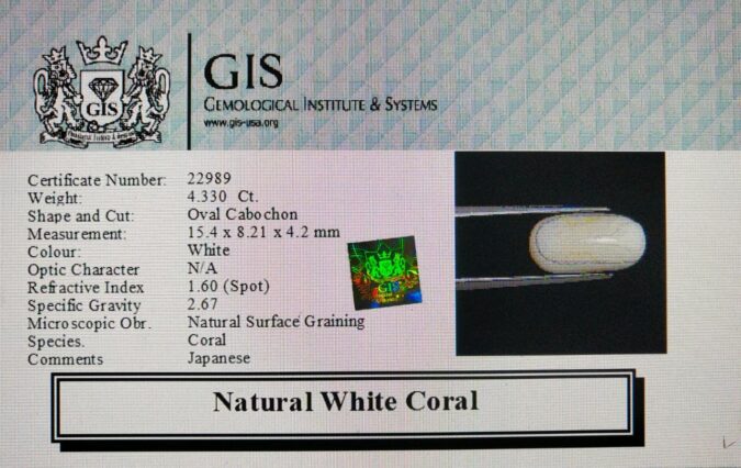 Beautiful 4.33 Ct. White Coral (Japanese Mines) Sava 4 Ratti Saphed Moonga. Free Horoscope & Free Pundit Ji Advise / Consultation. Original Natural Lab certified gems by IGI GTL / Birth stones / Large Gem Selection of shree shubh Rashi Ratan Vedic dhan at Gem Mines. May Bhagwan Brahma, Vishnu, Shiv & Universe bless you.
