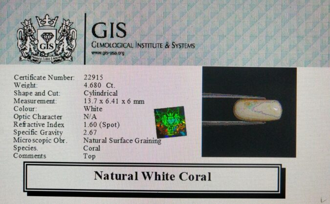 Beautiful 4.68 Ct. White Coral (Japanese Mines) Sava 5 Ratti Saphed Moonga. Free Horoscope & Free Pundit Ji Advise / Consultation. Original Natural Lab certified gems by IGI GTL / Birth stones / Large Gem Selection of shree shubh Rashi Ratan Vedic dhan at Gem Mines. May Bhagwan Brahma, Vishnu, Shiv & Universe bless you.
